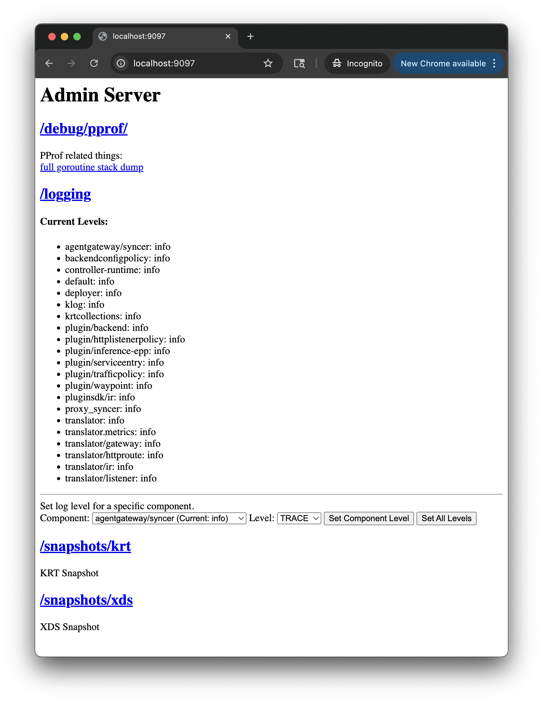 Endpoint Description /debug/pprofView the pprof profile of the control plane. A profile shows you the stack traces of the call sequences, such as Go routines, that led to particular events, such as memory allocation. The endpoint includes descriptions of each available profile. /loggingReview the current logging levels of each component in the control plane. You can also interactively set the log level by component, such as to enable DEBUGlogs./snapshots/krtView the current krt snapshot, or the point-in-time view of the transformed Kubernetes resources and their sync status that the control plane processed. These resources are then used to generate gateway configuration that is sent to the gateway proxies for routing decisions. /snapshots/xdsThe xDS snapshot is used for Envoy-based kgateway proxies, not agentgateway proxies.